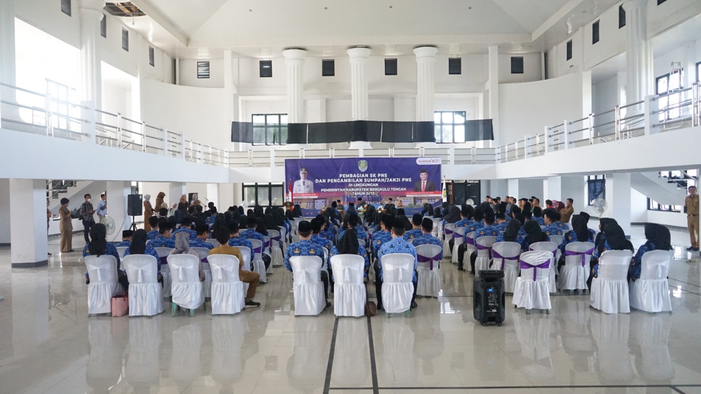 Bengkulu Tengah, MC Benteng - Pemerintah Kabupaten Bengkulu Tengah melalui Badan Kepegawaian Sumber Daya Manusia (BKPSDM) melaksanakan acara pengambilan Sumpah/Janji bagi CPNS formasi 2021 di Balai Raflesia Pusat Perkantoran Pemda Bengkulu Tengah. Selasa (28/3/2023)
