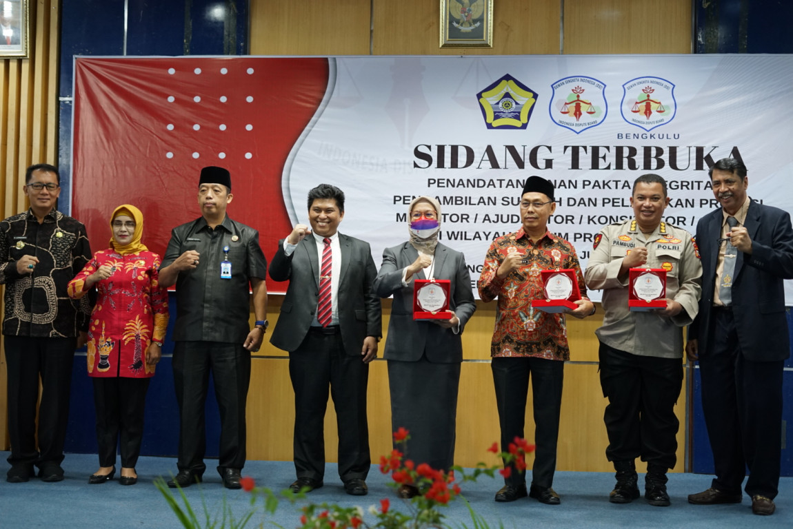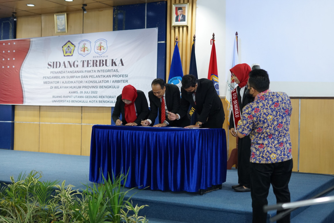 BENGKULU - Menindaklanjuti hasil dari Pelatihan Mediasi, Ajudikasi, Konsilasi, dan Arbiter Via Plaform Zoom oleh Dewan Sangketa Indonesia (DSI) bekerja sama dengan Fakultas Hukum Universitas Bengkulu, maka dilaksanakan penandatanganan pakta Integritas, Pengambilan Sumpah Profesi dan Pelantikan bagi Mediator, Ajudikator, Konsilator, serta Arbiter SDI di Wilayah Hukum Provinsi Bengkulu.