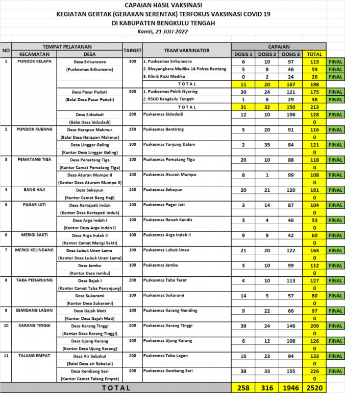 Kabupaten Bengkulu Tengah mendapatkan pencapaian 100 % yaitu 2520 dari Jumlah target sebanyak 2500 orang yang tervaksinasi.dengan melibatkan 20 puskesmas yang ada di Kabupaten Bengkulu Tengah dan 20 Lokasi terfokus (Lokus) yang tersebar di 11 Kecamatan Wilayah Kabupaten Bengkulu Tengah. Pelaksanaan Gertak itu sendiri di pusatkan di Desa Sri Kuncoro Kecamatan Pondok Kelapa.