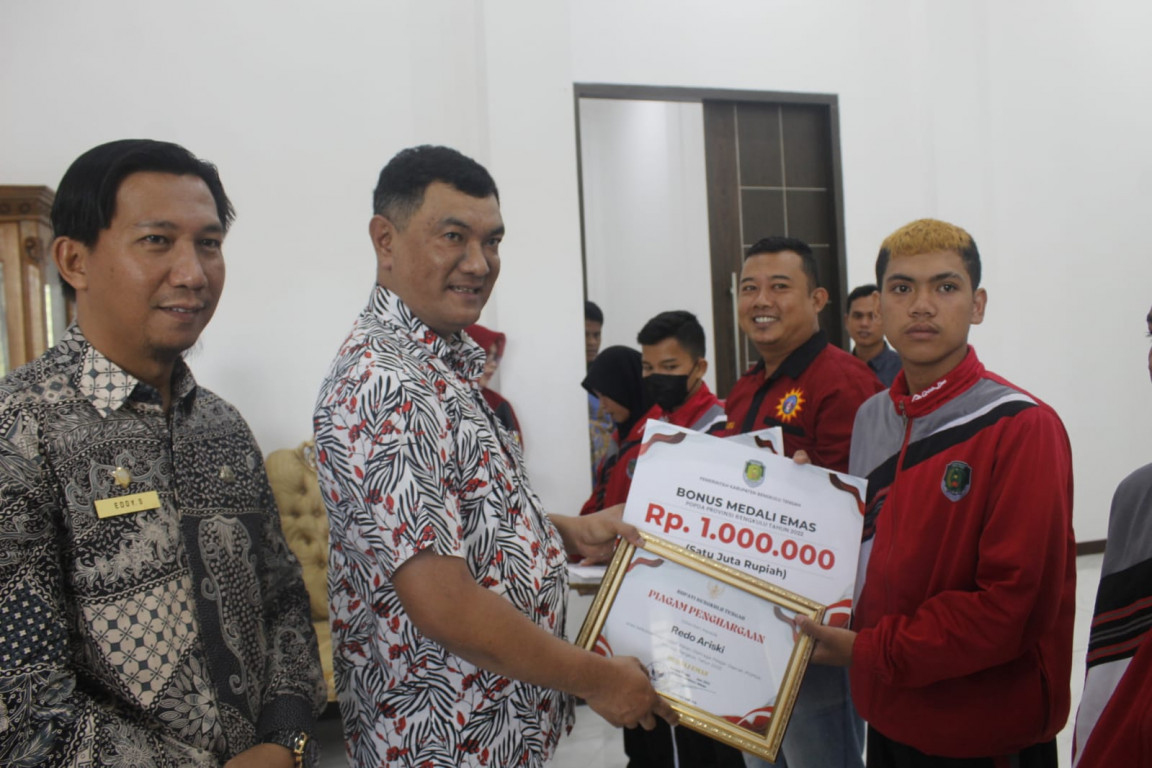 BENGKULU TENGAH- Pemerintah Kabupaten Bengkulu Tengah berikan reward dan piagam penghargaan kepada atlet berprestasi dalam ajang Pekan Olahraga Pelajar Daerah (POPDA) tahun 2022 yang diikuti oleh Cabang Olahraga (Cabor) Kabupaten/Kota Se-provinsi Bengkulu. Reward ini diberikan langsung oleh Pj Bupati Bengkulu Tengah Dr. Heriyandi Roni, M.Si.