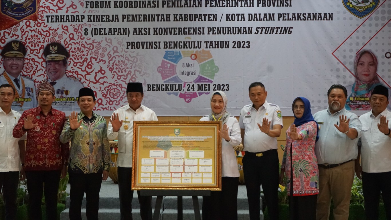 " Meski angka Stunting di Provinsi Bengkulu telah tembus di bawah persentase Nasional, akan tetapi tugas kita adalah menjadikan persentase Stunting jadi 14% harus semakin di perjuangkan. Kerja sama seluruh instansi vertikal maupun stakeholder lainnya sangat di butuhkan, terutama kolaborasi yang kuat antara pemerintah Provinsi Kabupaten/Kota maupun instansi lainnya. Untuk itulah perlu adanya penilaian kinerja bagi Kabupaten/Kota terhadap 8 (delapan) Aksi Konvergensi Stunting tersebut. Sehingga kita dapat menunjukkan semangat yang tinggi untuk memperoleh nilai terbaik demi menjadikan masyarakat di Provinsi Bengkulu sehat, bergizi tanpa ada yang mengalami Stunting," terangnya