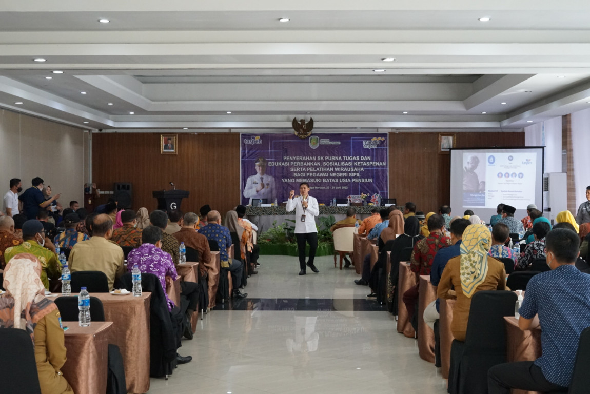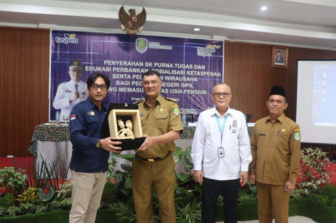 BENGKULU - Pemerintah Daerah Kabupaten Bengkulu Tengah melalui Badan Kepegawaian & Pengembangan Sumber Daya Manusia (BKPSDM) yang bekerja sama dengan Bank Mandiri Taspen dan PT. Taspen melaksanakan Sosialisasi Ketaspenan dan pelatihan wirausaha bagi PNS yang memasuki usia pensiun, sekaligus penyerahan Surat Keputusan (SK) Purna tugas.