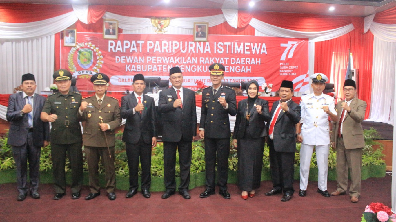 Turut hadir Ketua DPRD Bengkulu Tengah Budi Suryantono, S.Sos.,M.Si., Kajari Bengkulu Tengah Tri Widodo, S.H., M.H., Pabung TNI Letkol (Inf) Abrori Abbas, S.E., M.T., Wakapokres Kompol Januri Sutirto, S.H., Danpos TNI AL M. Roni, Waka I DPRD Ferri Heriyadi, S.Sos., M.Si., Waka II DPRD Evi Susanti, S.Ip., Seluruh Anggota DPRD, Pj. Sekda Drs. Hendri Donal, S.H., M.H., Asisten I, II, dan III, seluruh Staf Ahli, Seluruh Kepala OPD, Camat dan Kepala Bagian di Pemerintahan Kabupaten Bengkulu Tengah serta undangan lainnya.