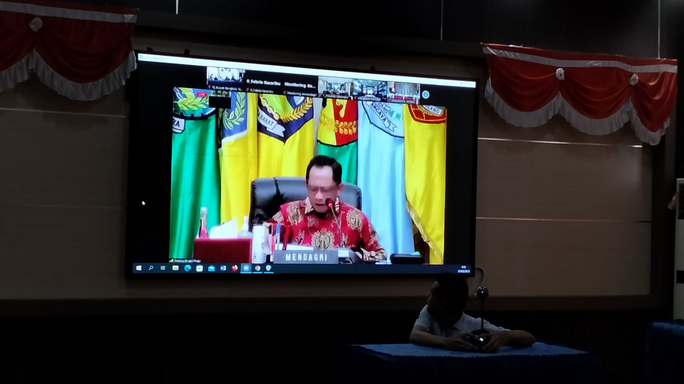 Penjabat Bupati Bengkulu Tengah Dr. Heriyandi Roni, M.Si., didampingi Pj. Sekretaris Daerah Drs. Hendri Donal, S.H , M.H., Asisten Bidang Ekonomi dan Pembangunan Eka Nurmaeni, S.E.,M.Pd., Asisten Bidang Administrasi Umum H. Elyandes Kori, S.E..M.Si., unsur TNI/Polri serta Kepala Bagian terkait di Pemerintah Daerah Bengkulu Tengah mengikuti Vidcon yang di pimpin oleh Menteri Dalam Negeri Tito Karnavian dan Menko Bidang Marves Luhut B. Pandjaitan.