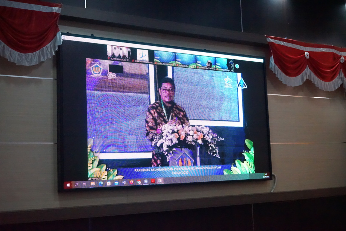 BENGKULU TENGAH - Penjabat Bupati Bengkulu Tengah Dr. Heriyandi Roni, M.Si., melalui Asisten Administrasi Umum H. Elyandes Kori, S.E., M.Si., menghadiri Acara Puncak Rapat Kerja Nasional (Rakernas) akuntansi dan laporan Keuangan Pemerintahan tahun 2022 melalui Vidio Conference (Vidcon).