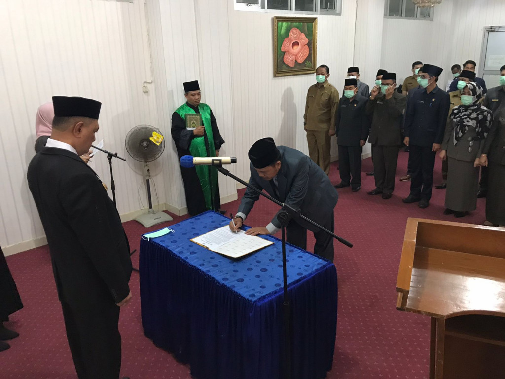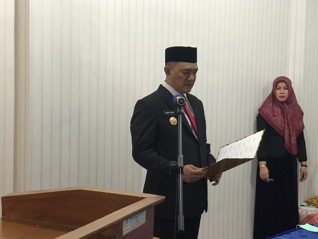 BENGKULU TENGAH- Pj Bupati Bengkulu Tengah Dr. Heriyandi Roni, M.Si Lantik Drs. Hendri Donal, SH.,MH sebagai Pj Sekretaris Daerah (Sekda) Bengkulu Tengah. Proses Pelantikan dan Pengambilan Sumpah ini berlangsung di Ruang Rapat Sekda Senin (25/07).