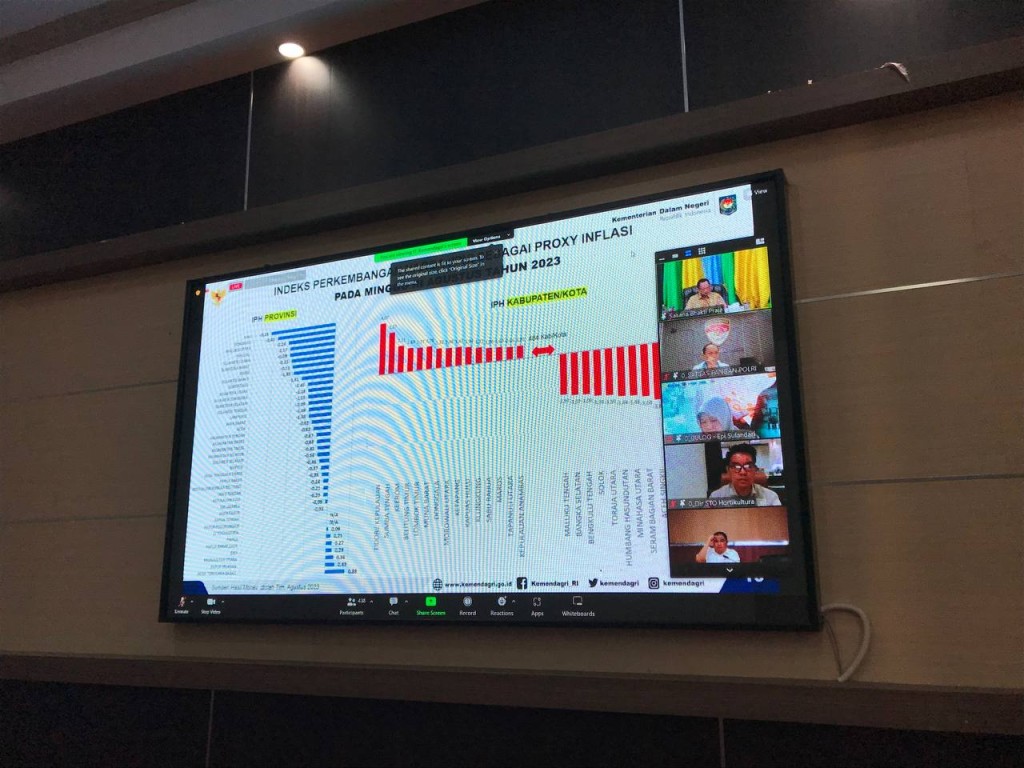 Pj Bupati Bengkulu Tengah Dr. Heriyandi Roni, M.Si melalui Staf Ahli Bupati Bidang Keuangan, Pembangunan dan Perekonomian H. Amirul, S.H.,M.H., didampingi oleh Tim Pengendalian Inflasi Daerah (TPID) mengikuti melalui zoom di Ruang Rapat Bupati (RRB). Senin (21/08/2023)