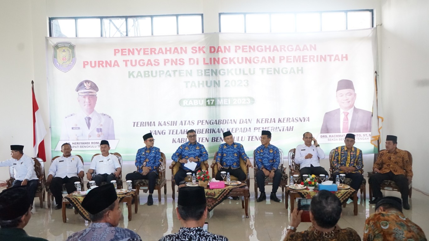 Bengkulu Tengah, MC Benteng - Pemerintah Kabupaten Bengkulu Tengah melalui Penjabat Bupati Dr. Heriyandi Roni, M.Si., di dampingi Sekretaris Daerah Drs. Rachmat Riyanto, S.T., M.AP., menyerahkan secara langsung Surat Keputusan (SK) Purna Tugas dan Plakat Penghargaan kepada 74 orang Aparatur Sipil Negara (ASN) di Ruang Lingkup Pemerintah Kabupaten Bengkulu Tengah bertempat di Pendopo Rumdin Bupati. Rabu (17/5/2023)