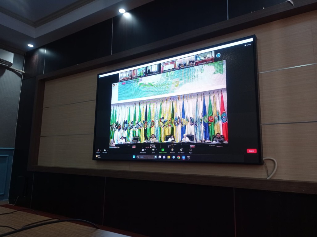Pj Bupati Bengkulu Tengah Dr. Heriyandi Roni, M.Si bersama Sekda Bengkulu Tengah Drs. Rachmat Riyanto, S.T.,M.AP didampingi oleh Tim Pengendalian Inflasi Daerah (TPID) mengikuti melalui zoom di Ruang Rapat Bupati (RRB), Senin (31/07/2023).