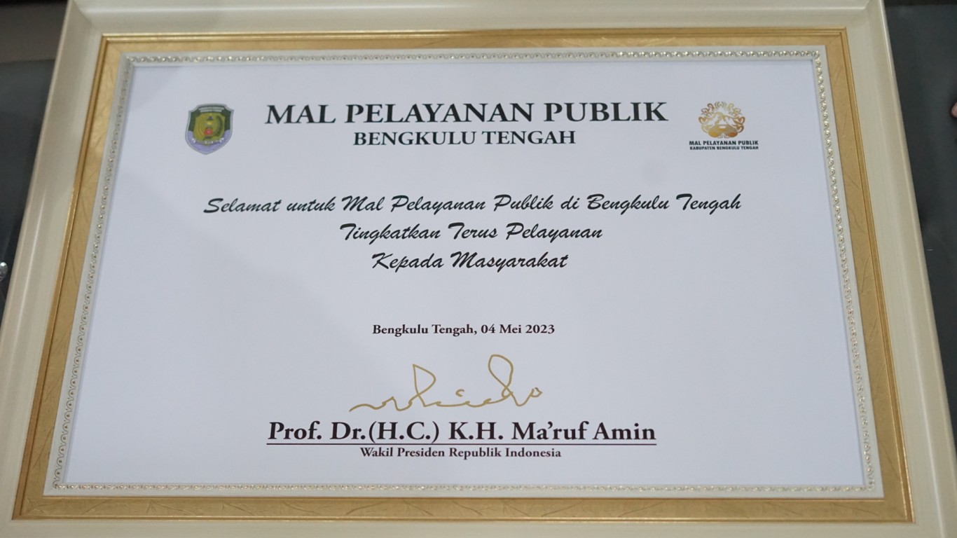 " Salah satu Kabupaten di Provinsi Bengkulu yang memilik Mal Pelayanan Publik adalah Kabupaten Bengkulu Tengah, pelayanan yang di berikan harus semakin optimal, mudah dan cepat melalui digital. Sehingga di harapkan kedepannya pelayanan-pelayanan bagi masyarakat dapat secara efisien dengan jalan yang semakin cepat dan tepat," Pungkas Wapres